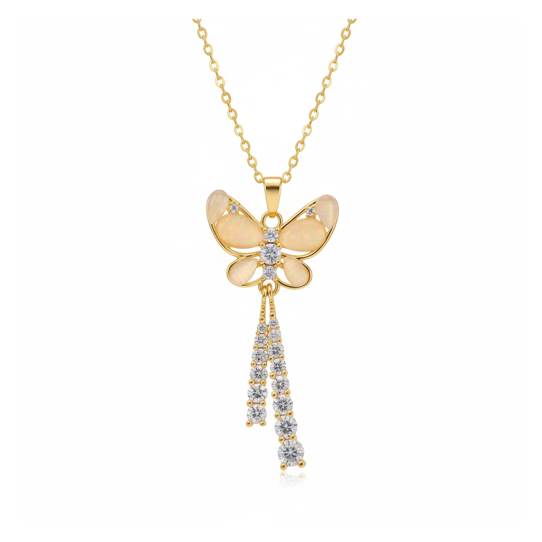 Discover the charm of the Luna necklace, captivating with its intricate butterfly design. The golden metal tone beautifully complements the sparkling cubic zirconia and delicate cat's eye imitation, creating a striking composition. A long, slender pendant adds elegance and elongates the silhouette. This is the perfect accessory to highlight your style for both evening outings and important celebrations. Feel special with this dazzling piece of jewelry.