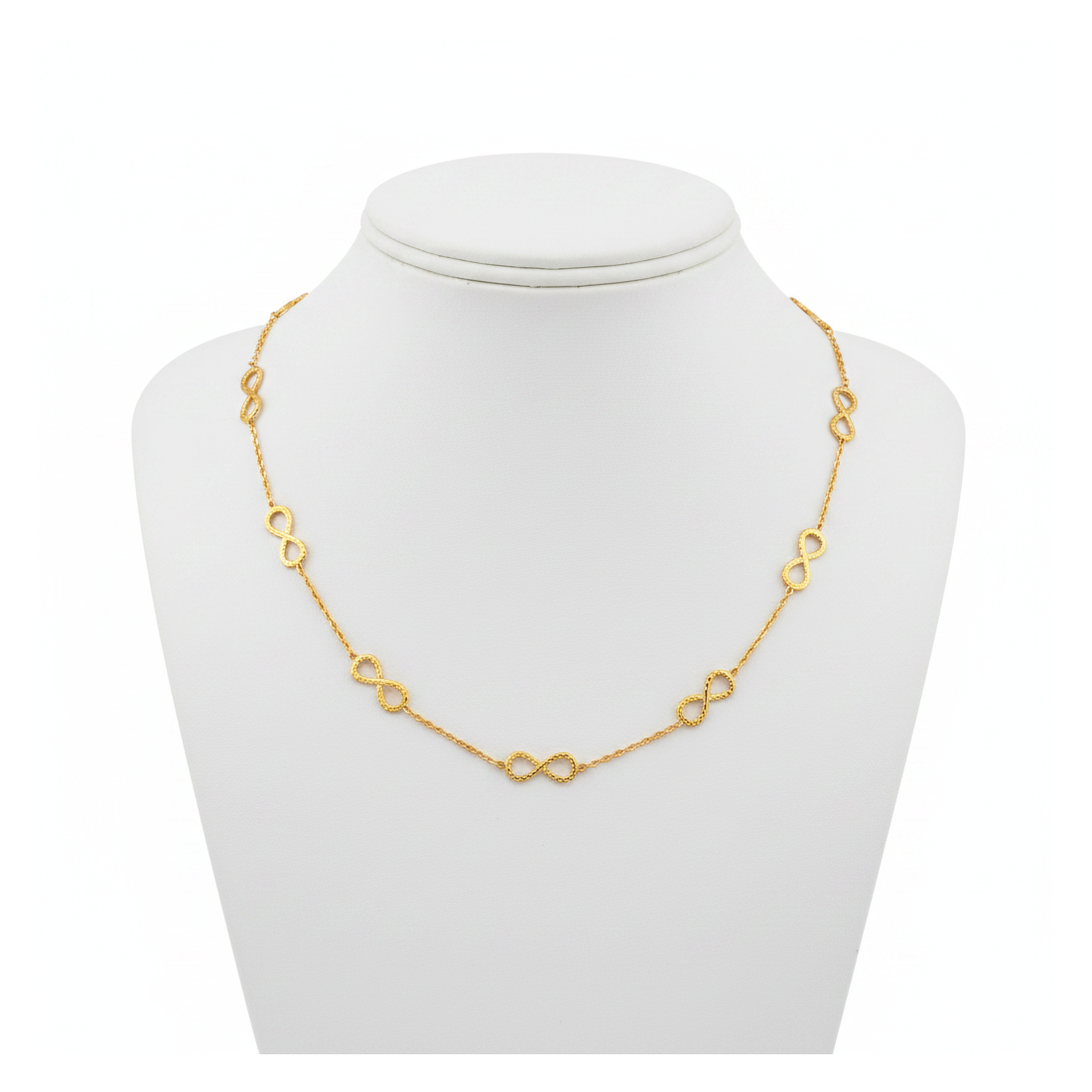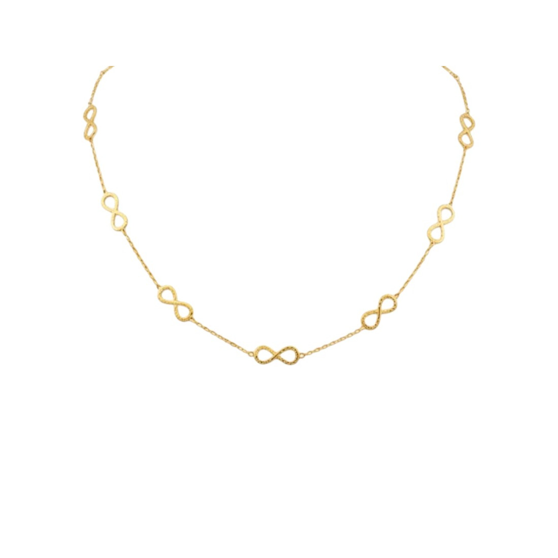 Discover the charm of infinity with this unique necklace. A delicate chain is adorned with subtle, textured infinity symbols that beautifully shimmer in the light. This gold-colored necklace is an ideal choice for women who appreciate elegance and symbolic meaning. Perfect for everyday wear or special occasions, adding sparkle to any outfit.