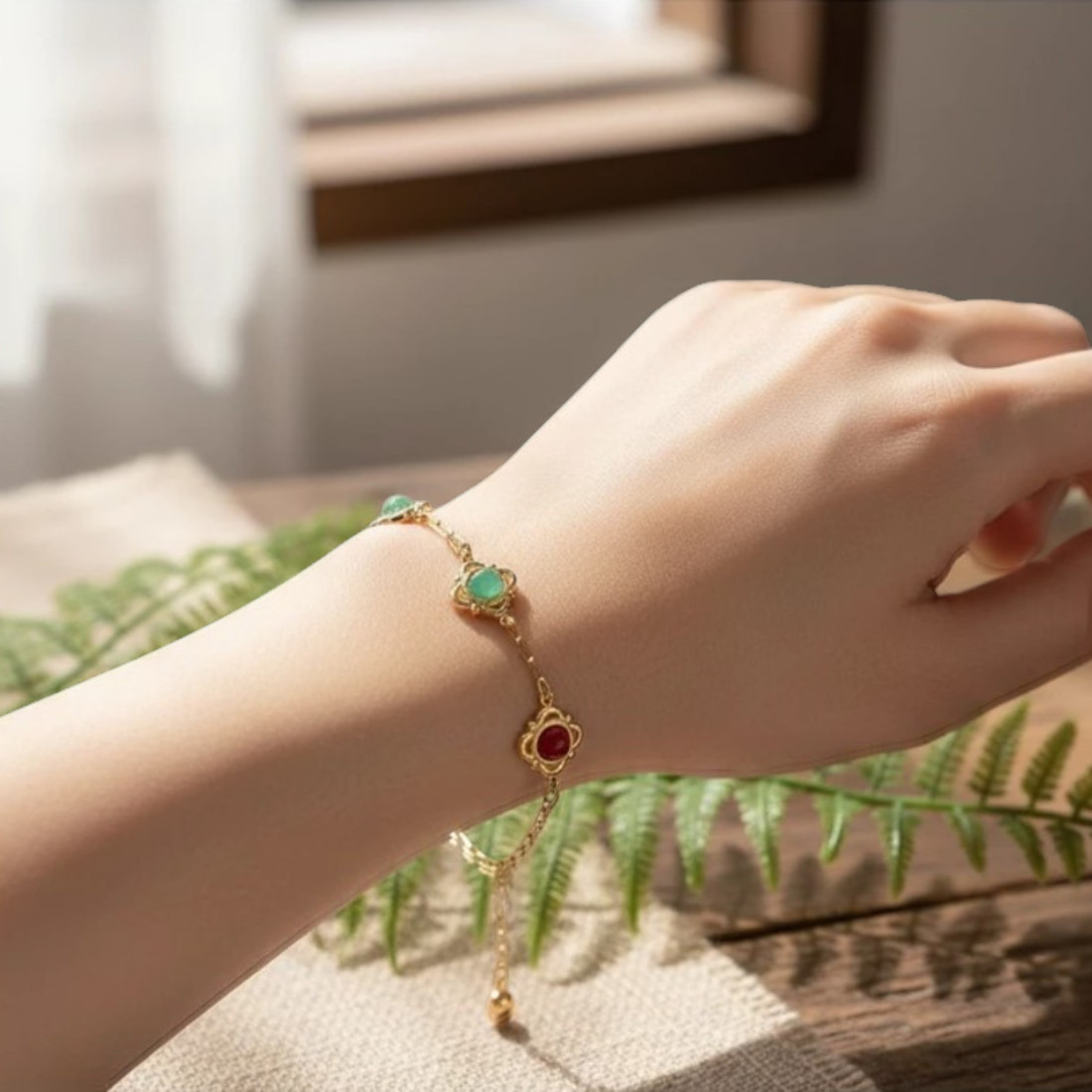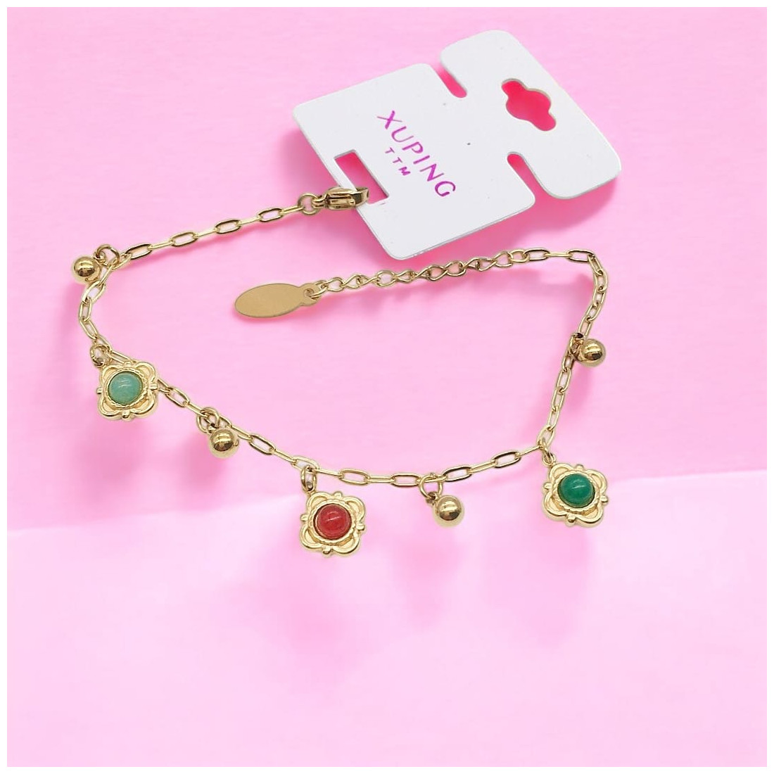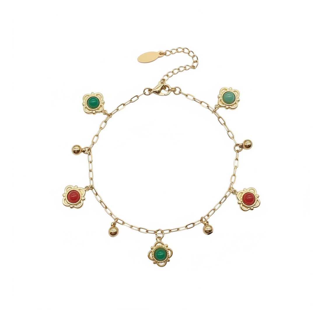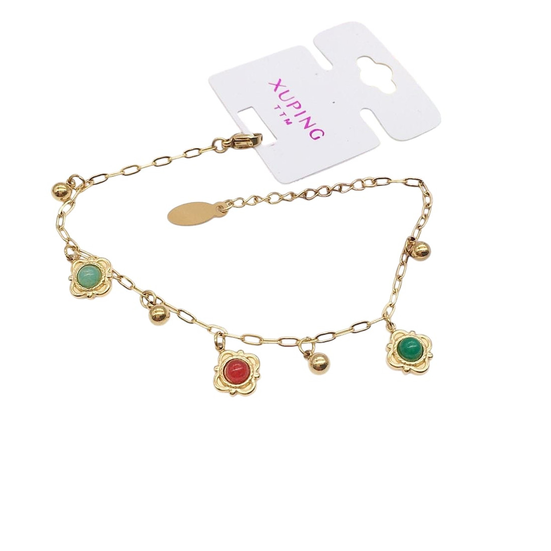 Odkryj urok bransoletki, która zachwyca delikatnym łańcuszkiem i uroczymi zawieszkami. Pozłacane elementy w połączeniu z kolorowymi kamieniami syntetycznymi w kształcie kwiatów dodają jej wyjątkowego blasku. To idealny dodatek, który podkreśli Twój styl, zarówno w codziennych stylizacjach, jak i na wieczorne wyjścia. Lekka i komfortowa w noszeniu, stanie się Twoim ulubionym elementem biżuterii.