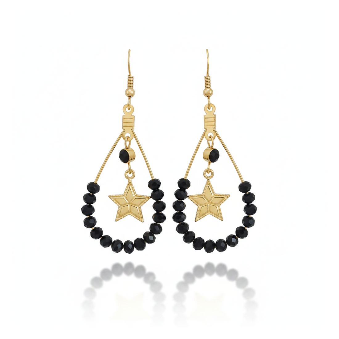 Oczaruj wszystkich z kolczykami Stella, które łączą w sobie elegancję złota z tajemniczym urokiem czarnych koralików. Ich wisząca forma, ozdobiona uroczymi gwiazdkami, pięknie podkreśli Twoją szyję i doda blasku każdej stylizacji. Idealne zarówno na wieczorne wyjścia, jak i do codziennych, bardziej odważnych zestawów. Te kolczyki to doskonały wybór dla kobiet ceniących sobie oryginalność i subtelny glamour.