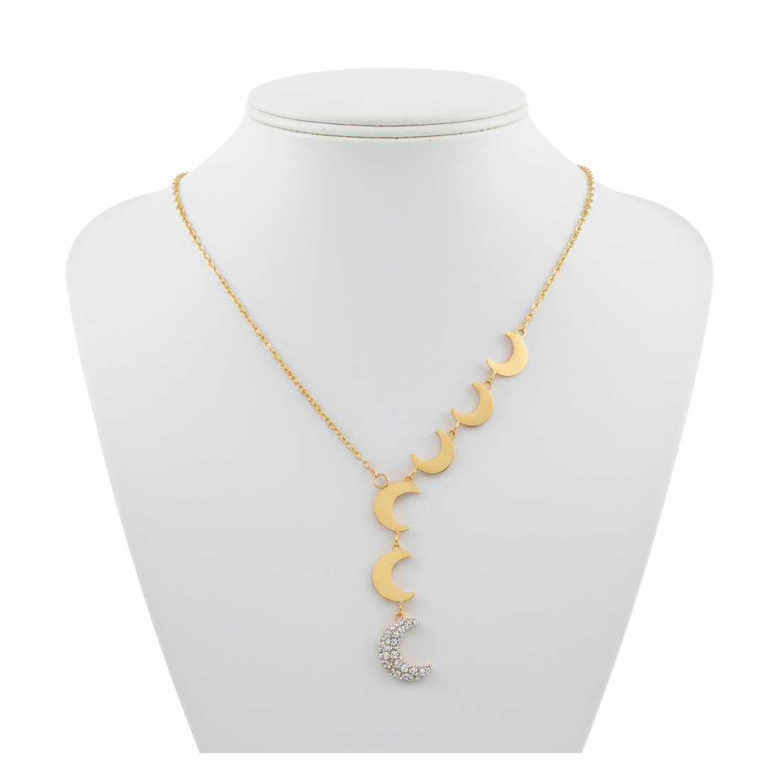 Odkryj magiczny naszyjnik 'Księżycowa Poświata', który zachwyca kaskadą pięciu gładkich, złotych księżyców i jednego większego, olśniewającego blaskiem cyrkonii. Ten elegancki dodatek doskonale podkreśli Twój dekolt, dodając subtelnego glamouru. Idealny na wieczorne wyjścia, randki czy jako wyjątkowy element codziennej stylizacji. Wykonany z pozłacanego stopu metali, gwarantuje trwałość i piękny wygląd na długo.