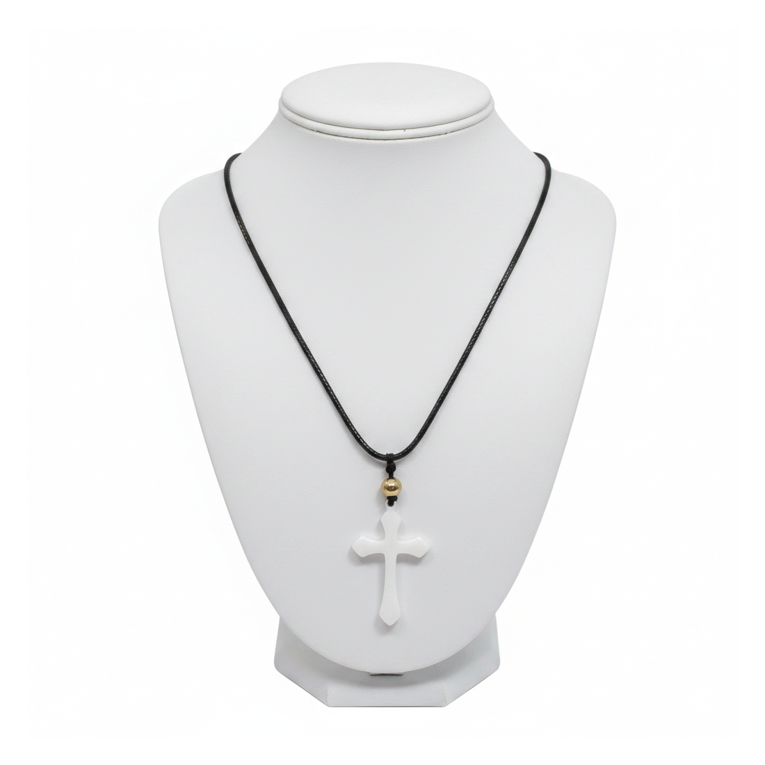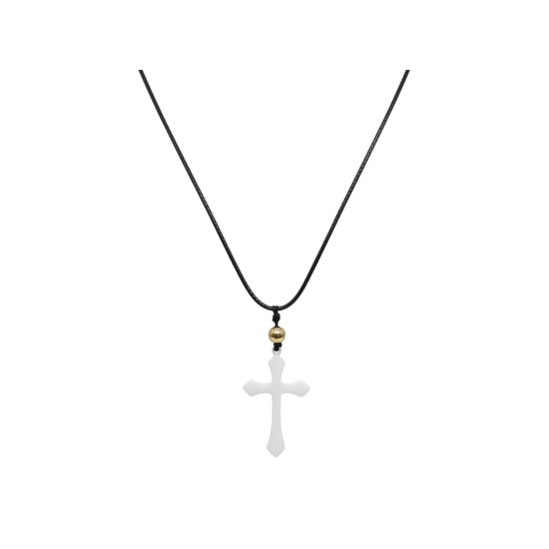 Odkryj naszyjnik Biały Krzyż, który łączy klasyczną symbolikę z nowoczesnym designem. Biały krzyż, wykonany z gładkiego materiału, pięknie kontrastuje z czarnym, regulowanym sznurkiem. Złota kuleczka dodaje subtelnego blasku, podkreślając wyjątkowy charakter biżuterii. Ten uniwersalny dodatek doskonale sprawdzi się zarówno na co dzień, jak i na specjalne okazje, dodając stylizacji głębi i osobistego wyrazu. Idealny dla osób ceniących biżuterię z przesłaniem.