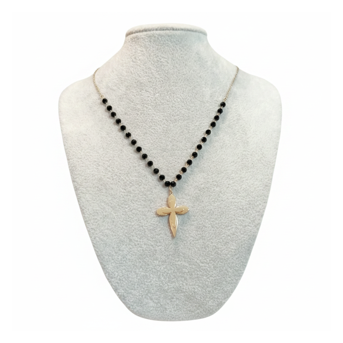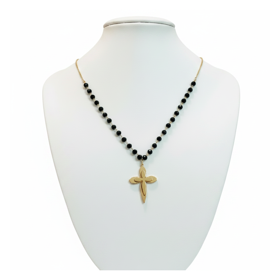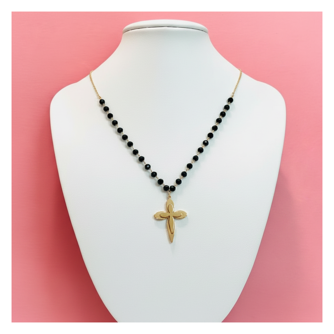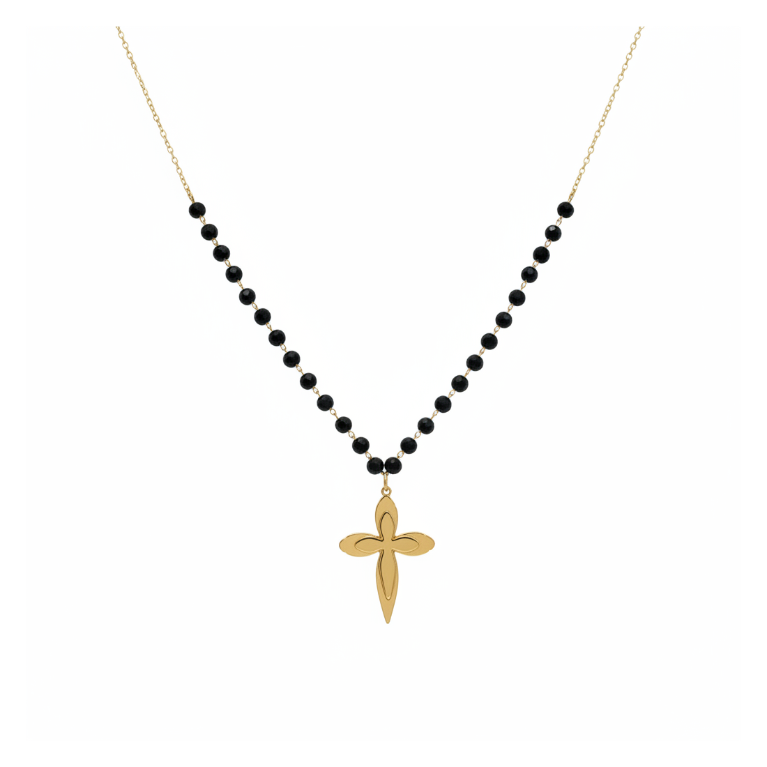 Odkryj urok naszyjnika Blossom, który łączy klasyczną elegancję z nowoczesnym akcentem. Delikatne, fasetowane czarne koraliki pięknie odbijają światło, tworząc subtelny blask. Centralnym punktem jest gładki, złoty krzyżyk, symbolizujący wiarę i styl. Idealny do noszenia na co dzień, jak i na specjalne okazje, dodając szyku każdej stylizacji. Podkreśl swoją indywidualność z tym wyjątkowym dodatkiem.