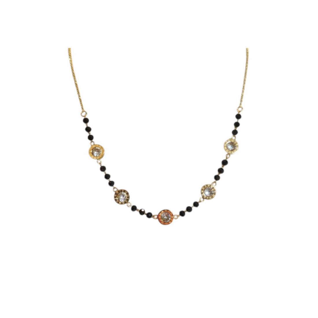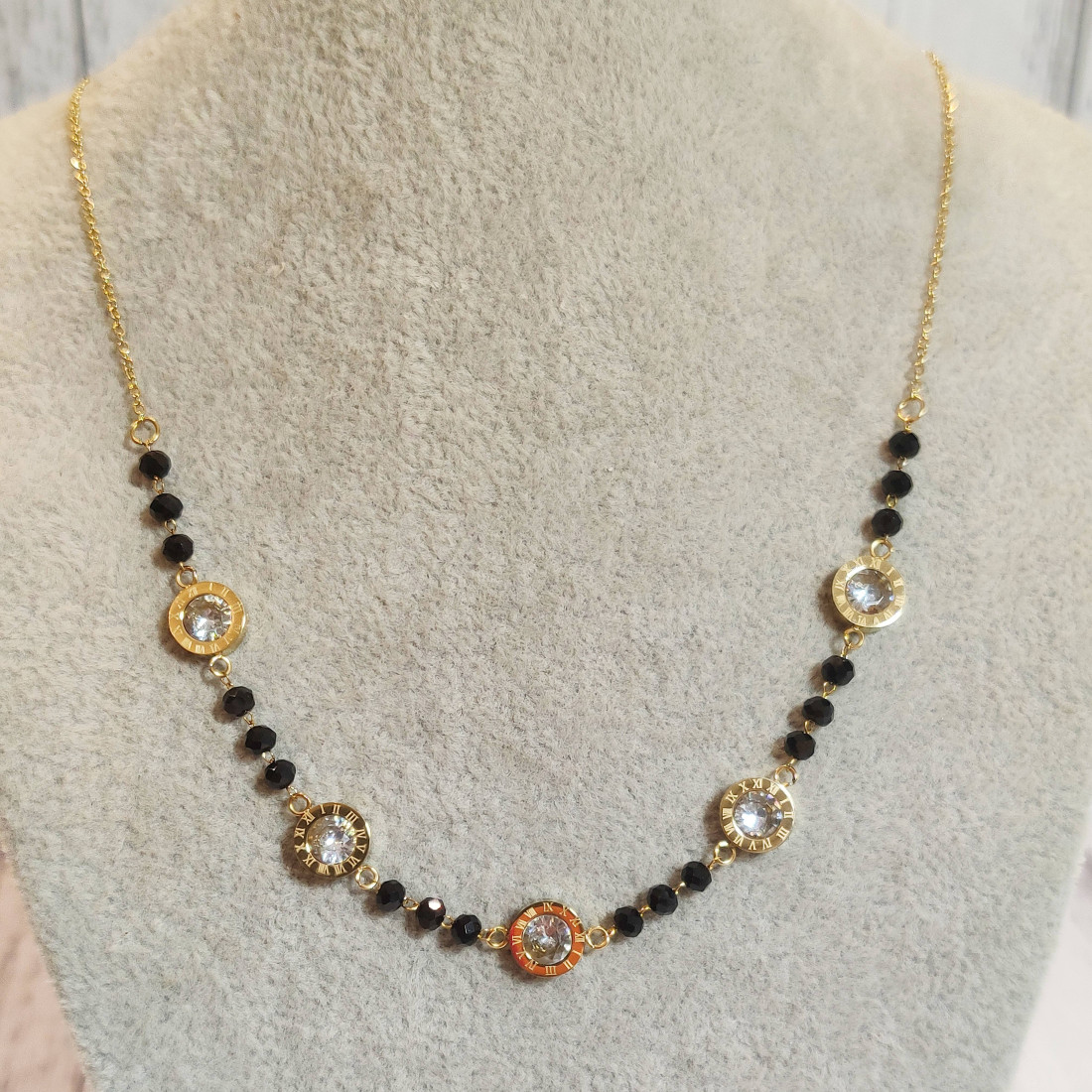 Odkryj blask z naszym naszyjnikiem Glamour, który łączy klasyczną elegancję z nowoczesnym designem. Pozłacane elementy z rzymskimi cyframi i lśniącymi cyrkoniami przeplatają się z fasetowanymi czarnymi koralikami, tworząc unikalną kompozycję. Ten wyjątkowy dodatek doskonale podkreśli Twoją szyję, dodając szyku zarówno codziennym, jak i wieczorowym kreacjom. Idealny na specjalne okazje, jak i do urozmaicenia biurowego looku.