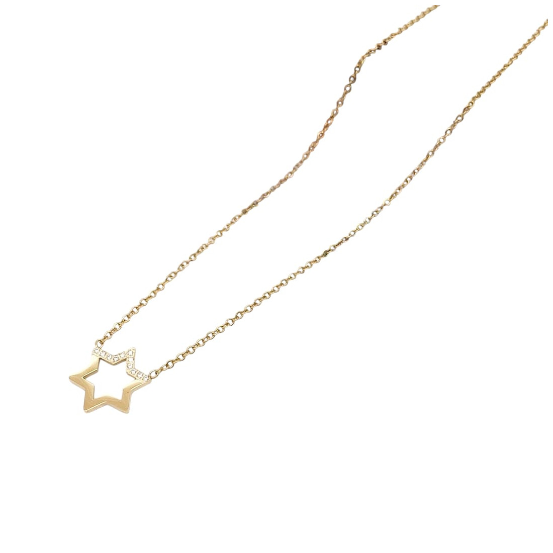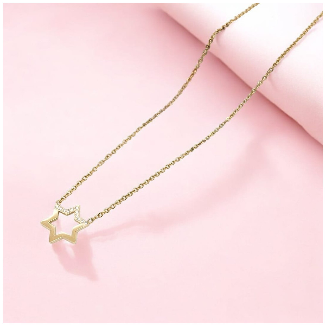 Delikatny naszyjnik na złotym łańcuszku z zawieszką w formie otwartej gwiazdki, której jeden róg zdobią cienkie, rozszerzone cyrkonie. Minimalistyczna forma i delikatny blask powodują, że pasuje do każdej stylizacji - od casualowej na co dzień, po romantycznej czy eleganckiej na wieczór. To ozdoba, która świetnie składa się zarówno sama, jak iw zestawieniu z innymi naszyjnikami w stylu Layering.