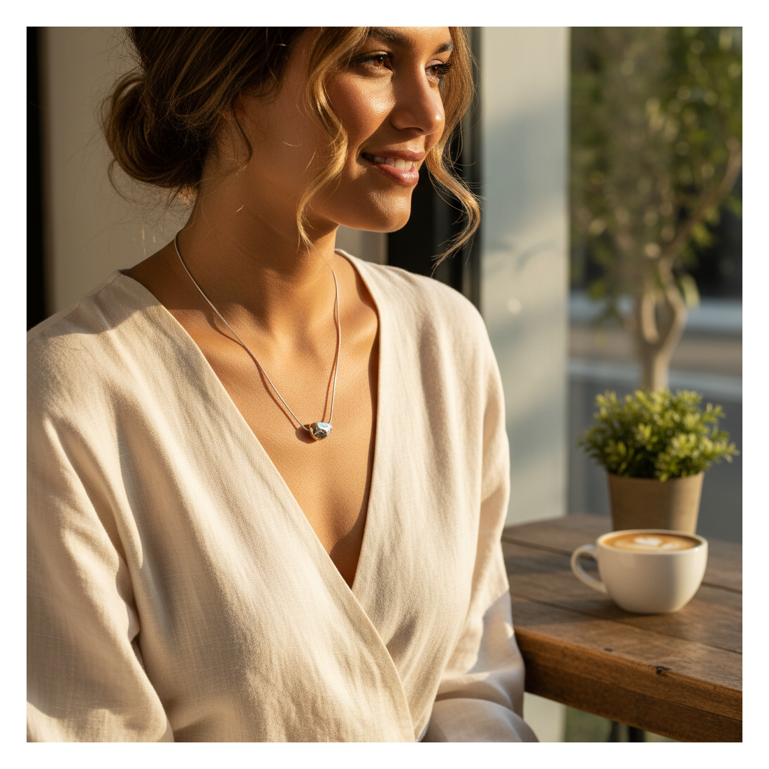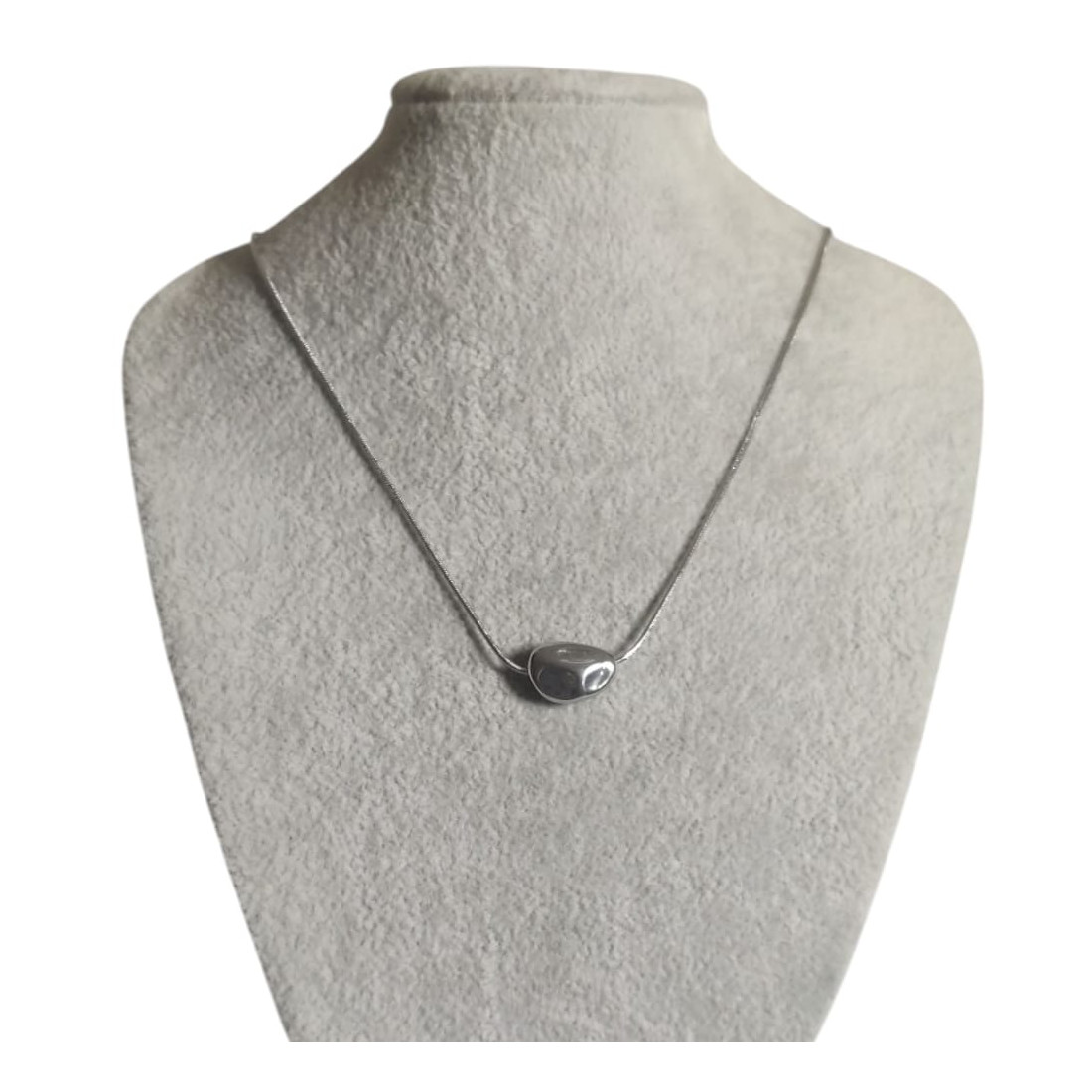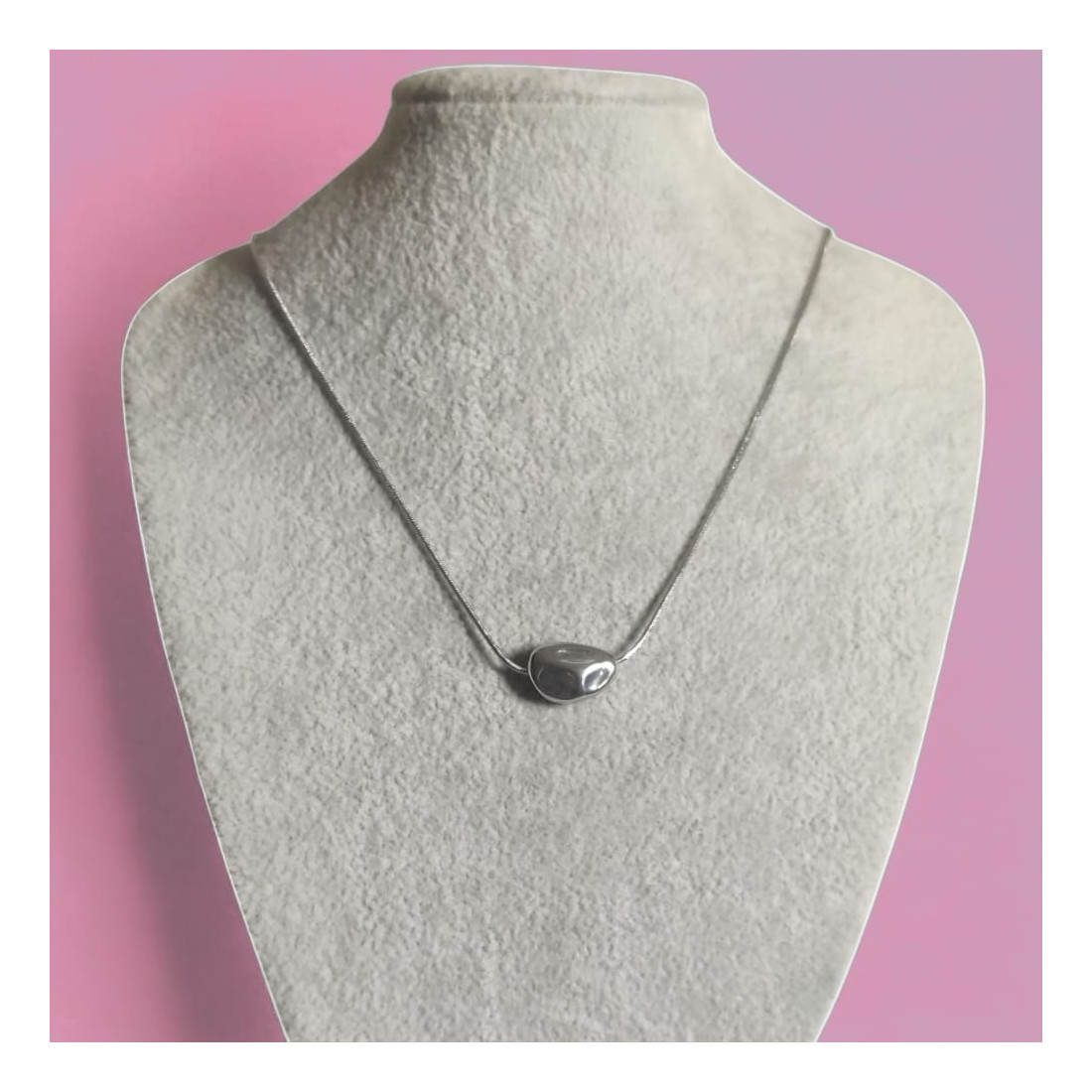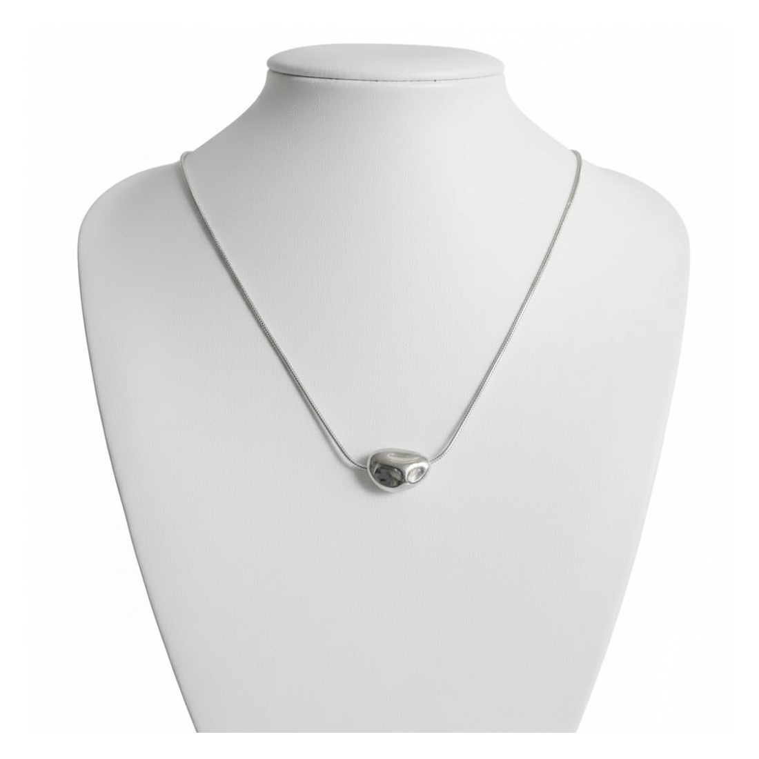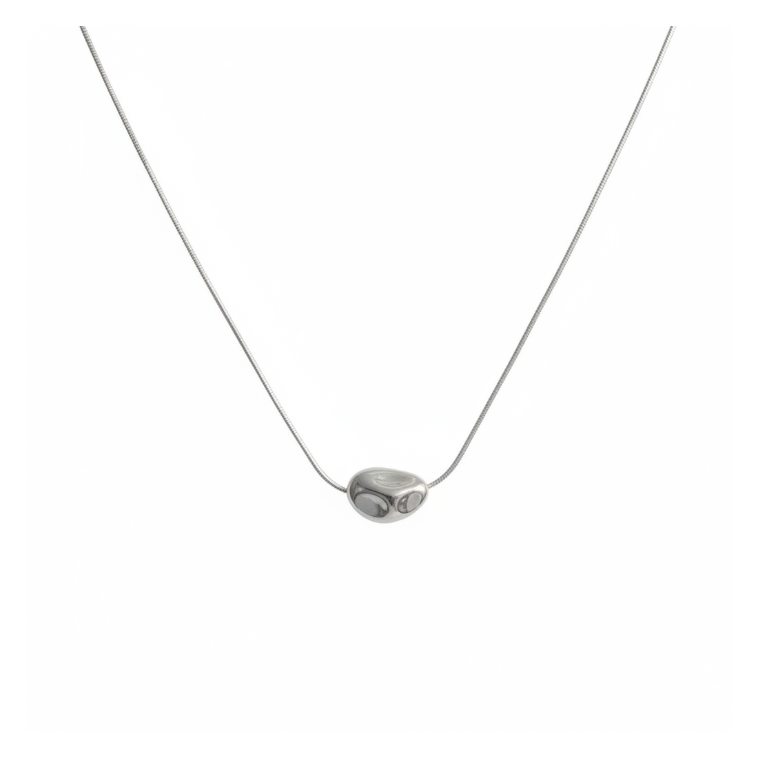 Ten uroczy naszyjnik z nieregularną zawieszką w kształcie kamyka to kwintesencja nowoczesnego stylu. Gładka, błyszcząca powierzchnia odbija światło, dodając blasku każdej stylizacji. Idealnie sprawdzi się jako subtelny akcent do codziennych outfitów, jak i elegancki dodatek na wieczorne wyjścia. Jego unikalny design sprawia, że jest to biżuteria, która przyciąga wzrok, jednocześnie zachowując minimalistyczny charakter. Doskonały wybór dla kobiet ceniących oryginalność i ponadczasową elegancję.