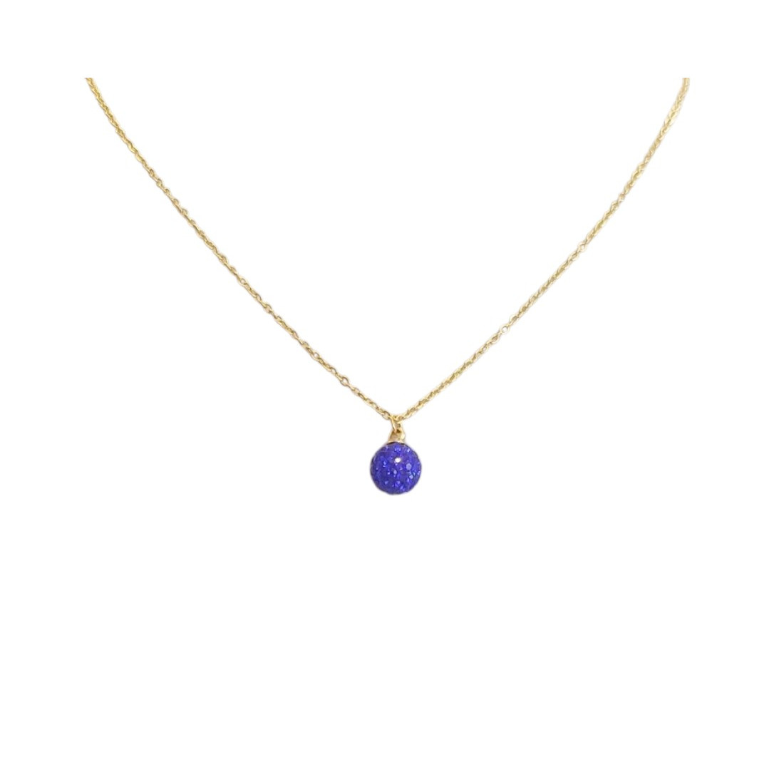 Delikatny naszyjnik na złotym łańcuszku z zawieszką w kształcie kulki wysadzanych drobnymi, kobaltowymi cyrkoniami, które mienią się i błyszczą w każdym świetle. Intensywny niebieski kolor zawieszki pięknie kontrastuje ze złotym łańcuszkiem, tworząc efektowną i stylową kompozycję. Świetnie pasuje do eleganckich stylizacji, ale także jako wyrazisty akcent do casualowego wyglądu na co dzień. To idealna ozdoba dla osób, które cenią drobną formę złożoną z występujących w kolorze i blaskiem.