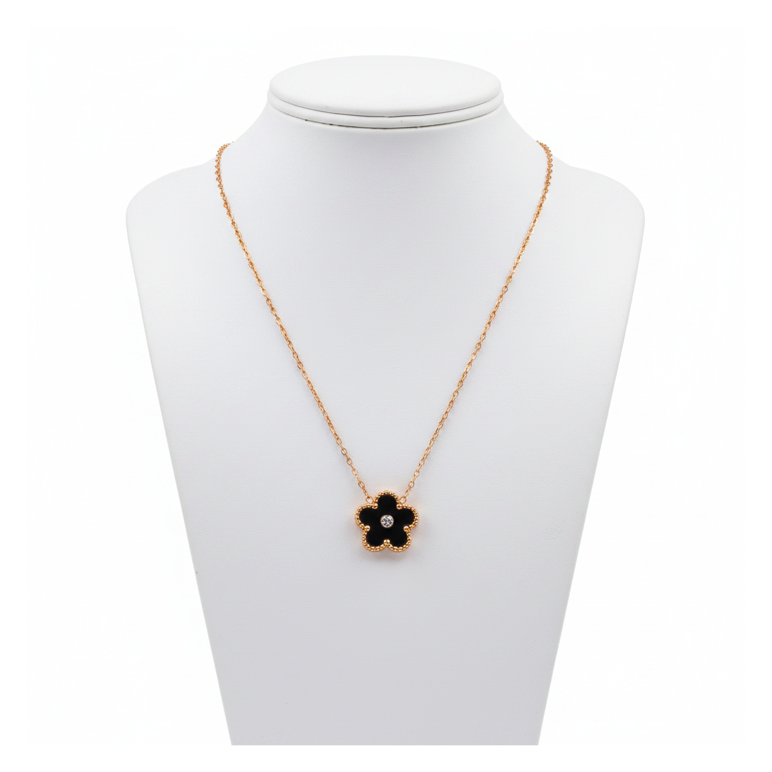 Odkryj urok naszyjnika kwiatek, który zachwyca swoim eleganckim designem. Złoty łańcuszek doskonale komponuje się z czarną zawieszką w kształcie kwiatu, ozdobioną błyszczącą cyrkonią. To idealny dodatek, który doda blasku zarówno wieczorowym kreacjom, jak i codziennym stylizacjom. Wykonany z dbałością o detale, podkreśli Twój wyjątkowy styl i doda nuty glamour.