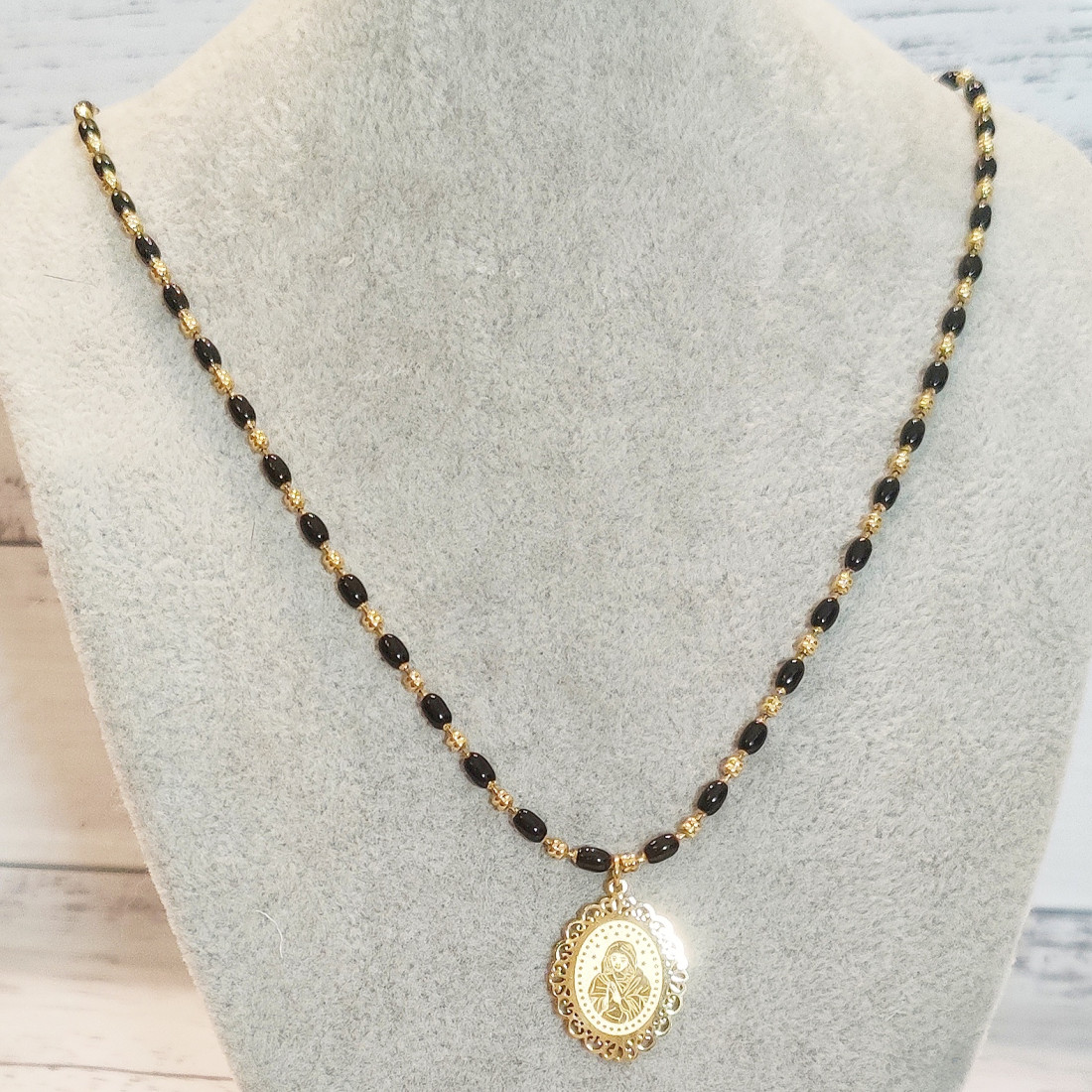 Piękny naszyjnik z czarnymi i złotymi koralikami z zawieszką w kształcie owalnego medalika z wizerunkiem Matki Boskiej w złotych, ażurowej oprawie. Przeplatające się czarne i złote elementy łańcuszka efektowną, klasyczną kompozycję, która nadaje całości dostojnego charakteru. Idealnie nadaje się do eleganckich stylizacji, ale także jako codzienna ozdoba dla osób noszących z zamieszkaniam. To piękny i symboliczny dodatek, który będzie wyjątkowym prezentem na komunię, bierzmowanie czy inne ważne uroczystości.