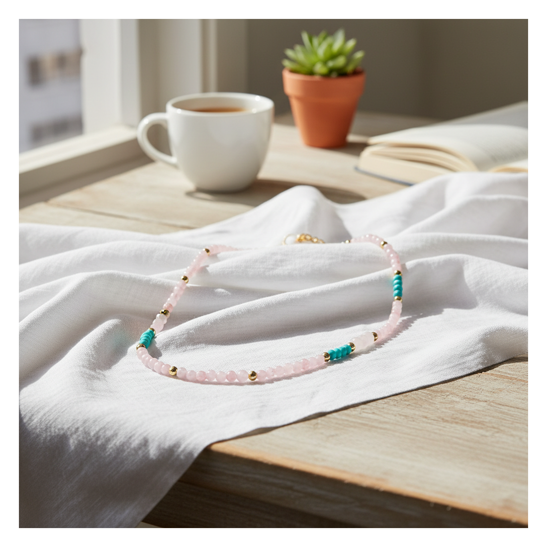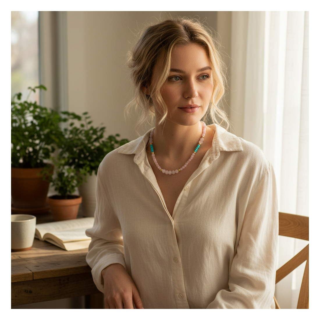 Odkryj urok naszyjnika Pastel Dream , który łączy w sobie delikatność różowego kwarcu z egzotycznym akcentem turkusu. Ten uroczy dodatek, wzbogacony o subtelne złote koraliki, idealnie podkreśli Twoją naturalną urodę i doda blasku każdej stylizacji. Doskonały na co dzień, jak i na specjalne okazje, wprowadzi do Twojej garderoby powiew świeżości i lekkości. Noś go solo lub w połączeniu z innymi, aby stworzyć unikalny, warstwowy look. To idealny wybór dla kobiet ceniących sobie elegancję w stylu boho i naturalne piękno.
