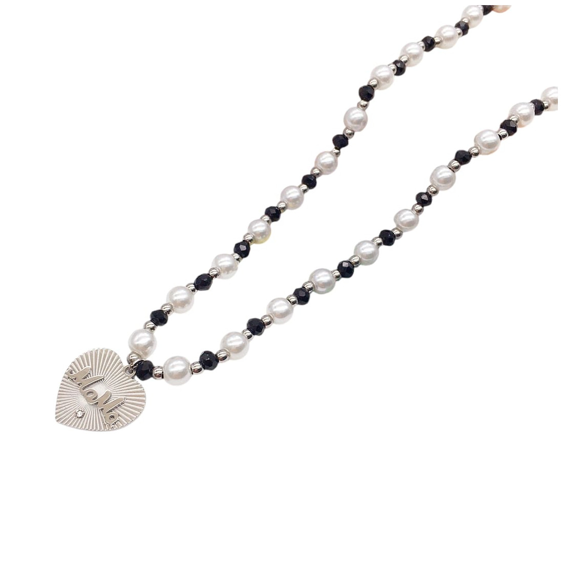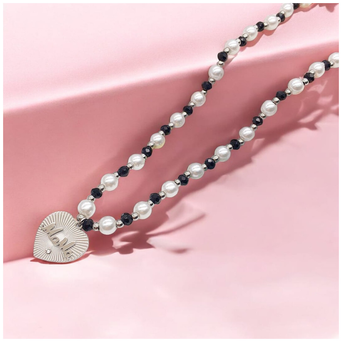 Odkryj urok naszyjnika Serce Mama, który łączy klasyczną elegancję z nowoczesnym akcentem. Delikatne, białe perły syntetyczne przeplatają się z lśniącymi czarnymi koralikami, tworząc harmonijną kompozycję. Centralnym punktem jest urocza zawieszka w kształcie serca z wygrawerowanym napisem "LOVE" i subtelną cyrkonią. Ten wyjątkowy dodatek doskonale podkreśli Twój styl na co dzień, jak i podczas specjalnych okazji.