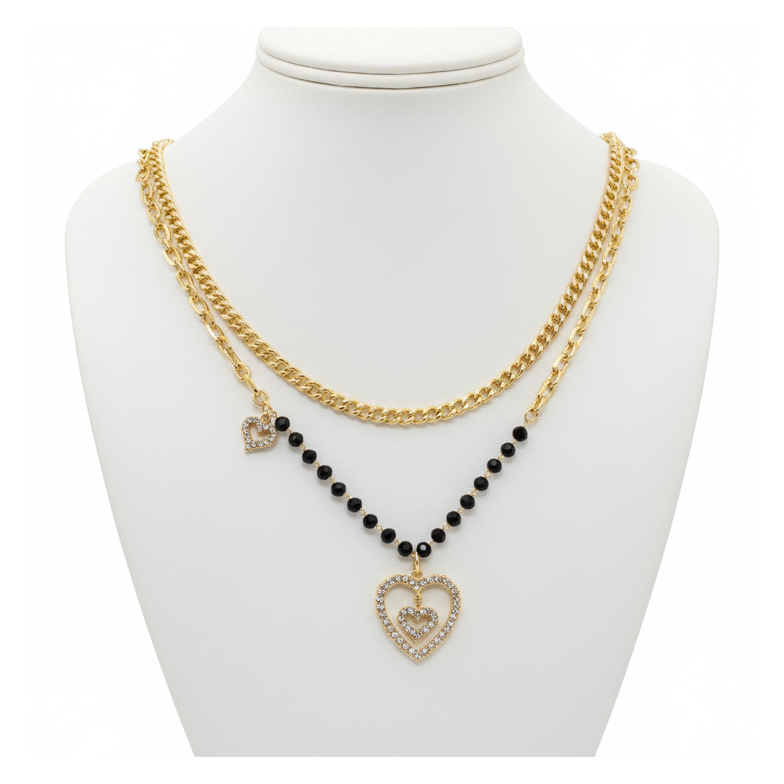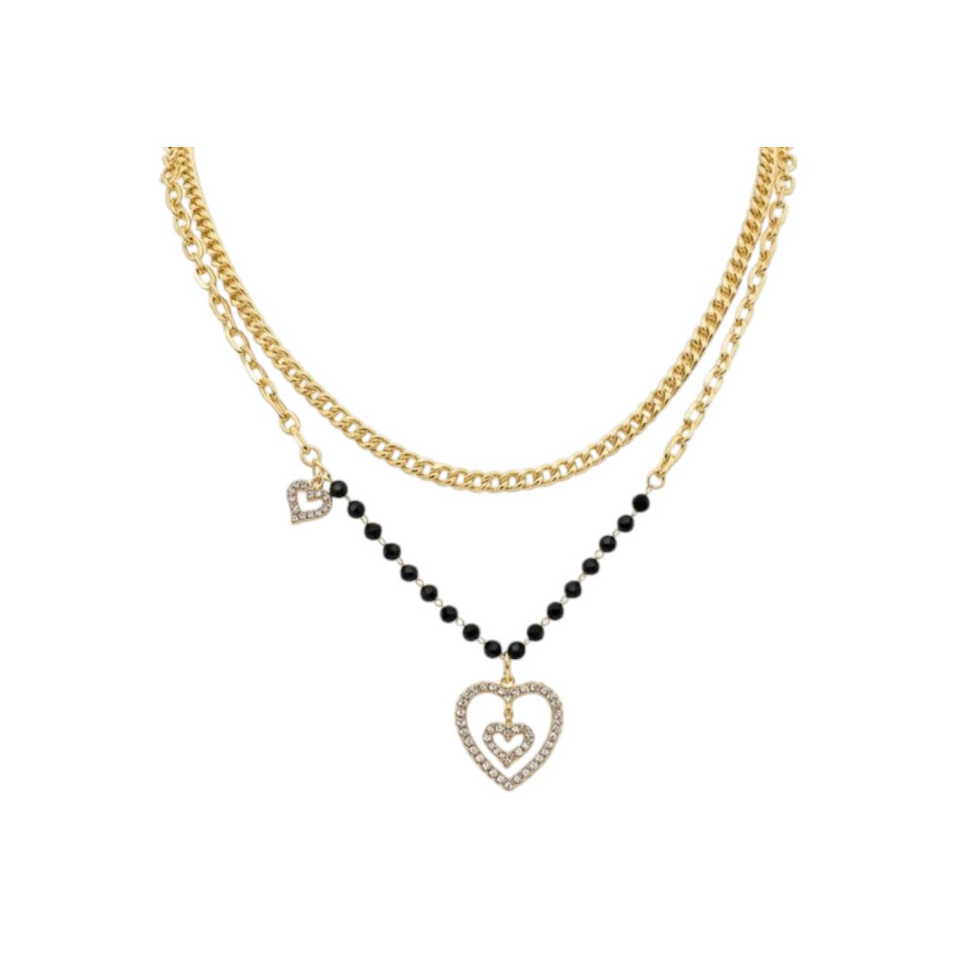 Ten uroczy, dwuwarstwowy naszyjnik to kwintesencja nowoczesnego glamour. Składa się z grubszego, złotego łańcuszka oraz delikatniejszego, ozdobionego czarnymi koralikami i dwoma sercami wysadzanymi lśniącymi cyrkoniami. Większe serce stanowi centralny punkt biżuterii, a mniejsze subtelnie dopełnia całość. Idealny do noszenia na co dzień, jak i na specjalne okazje, dodając blasku każdej stylizacji.