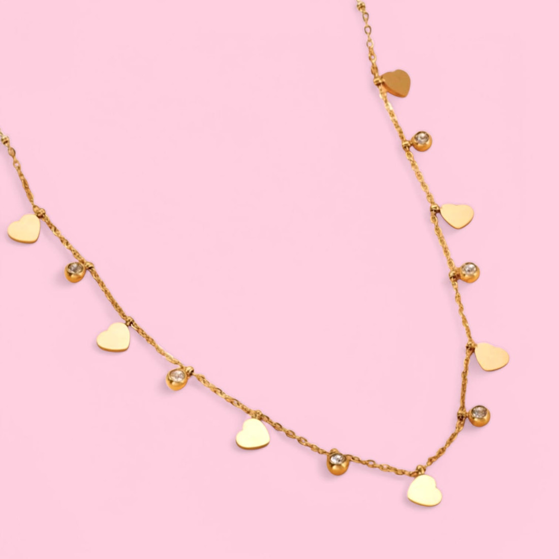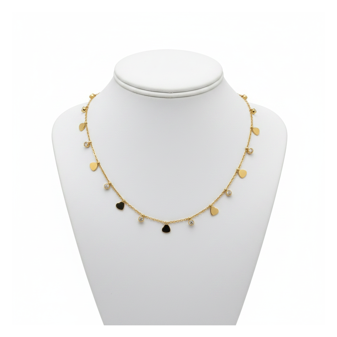 Odkryj urok naszyjnika Serduszka, który doda blasku każdej stylizacji. Ten delikatny, złoty łańcuszek zdobią urocze serduszka i subtelne, błyszczące cyrkonie, tworząc harmonijną kompozycję. Idealny na co dzień, jak i na specjalne okazje, podkreśli Twoją kobiecość i doda elegancji. Noś go solo lub w zestawie z inną biżuterią, aby stworzyć wyjątkowy look.