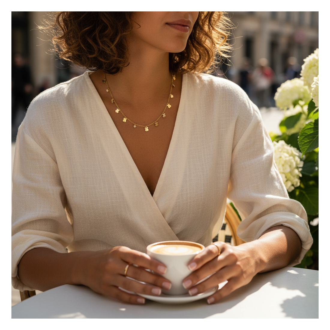Ten uroczy naszyjnik Flora to kwintesencja subtelnej elegancji. Drobne, złote koniczynki przeplatają się z lśniącymi cyrkoniami, tworząc harmonijną kompozycję. Idealny do noszenia na co dzień, jak i na specjalne okazje, dodając blasku każdej stylizacji. Podkreśl swój styl i poczuj się wyjątkowo z tym delikatnym akcentem.