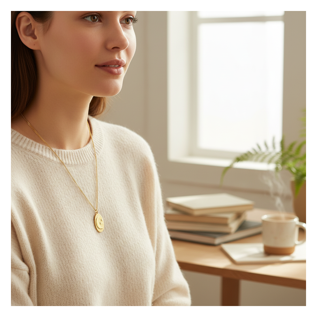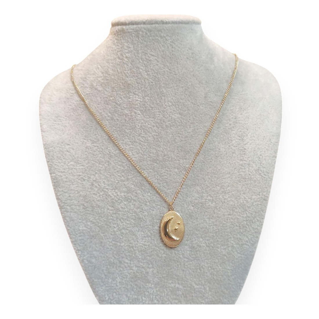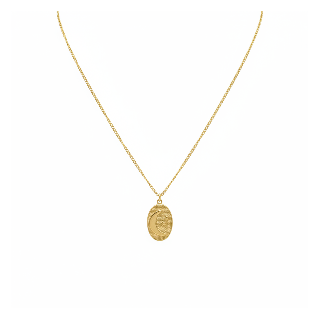 Odkryj urok nieba z naszym naszyjnikiem, który zachwyca delikatnością i symboliką. Złoty łańcuszek subtelnie podkreśla owalny medalion, na którym wygrawerowano stylowy księżyc i dwie gwiazdki. Ten wyjątkowy dodatek idealnie dopełni zarówno codzienne, jak i wieczorowe stylizacje, dodając im nuty tajemniczości i elegancji. Wykonany z pozłacanej stali nierdzewnej, gwarantuje trwałość i blask na długo. Noś go solo lub w zestawie z innymi delikatnymi łańcuszkami, tworząc modne warstwowe kompozycje.