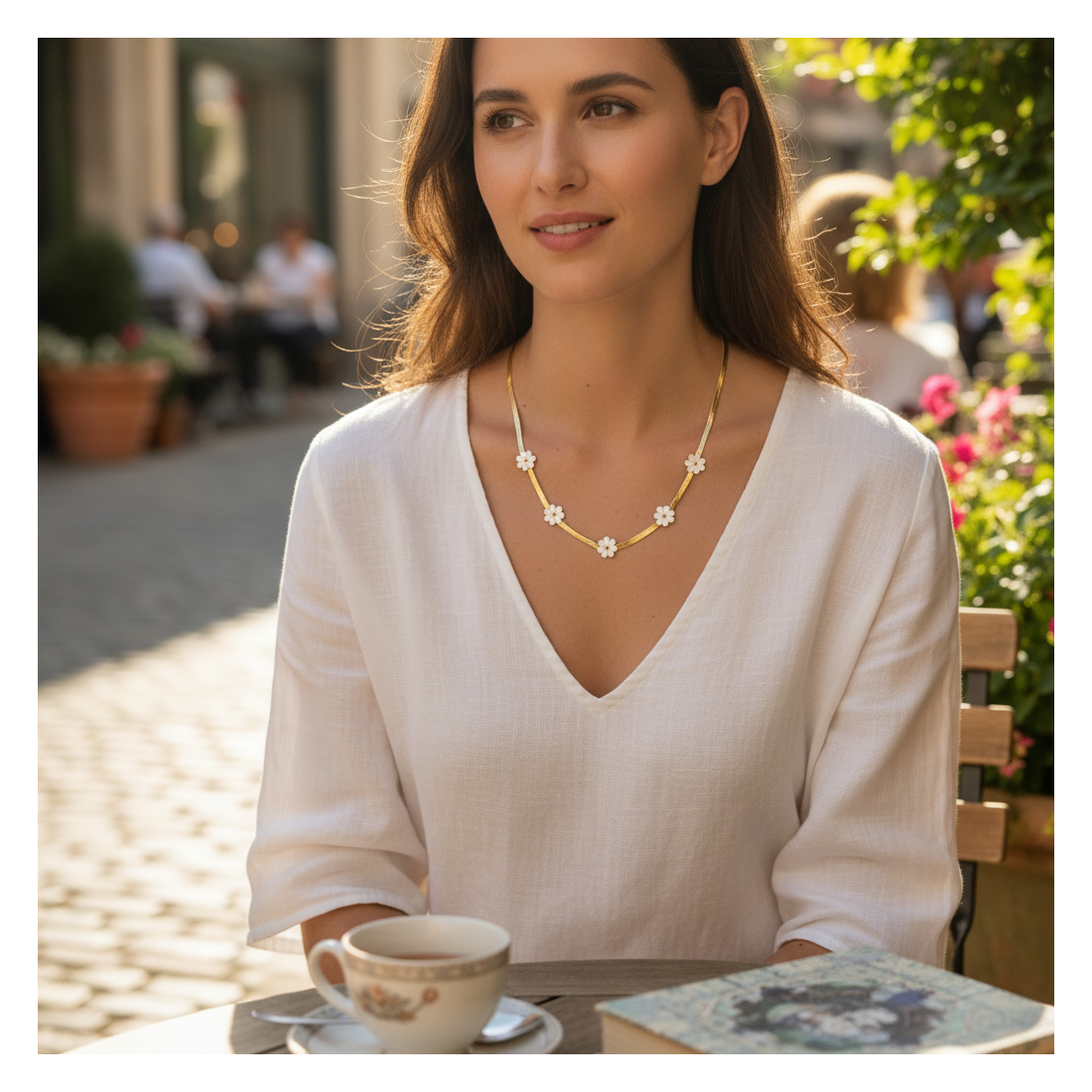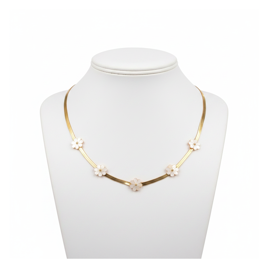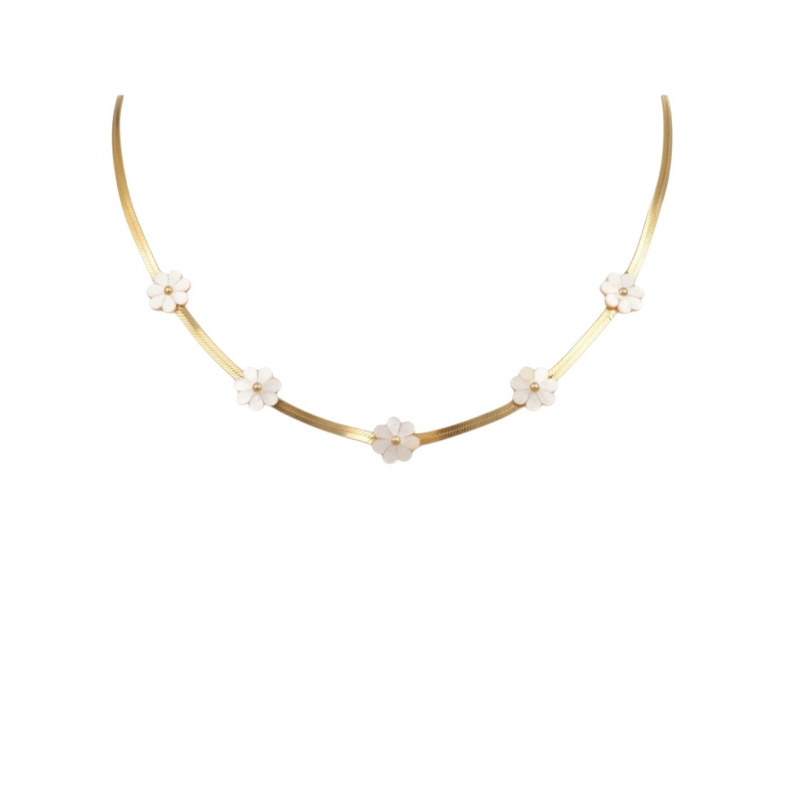 Odkryj urok naszyjnika Daisy, który zachwyca delikatnością i subtelnym blaskiem. Złoty łańcuszek typu żmijka pięknie układa się na dekolcie, a pięć uroczych kwiatków z masy perłowej dodaje mu lekkości. Idealny do letnich sukienek i eleganckich bluzek, podkreśli Twój kobiecy styl. To doskonały wybór na co dzień i na specjalne okazje, dodając blasku każdej stylizacji.