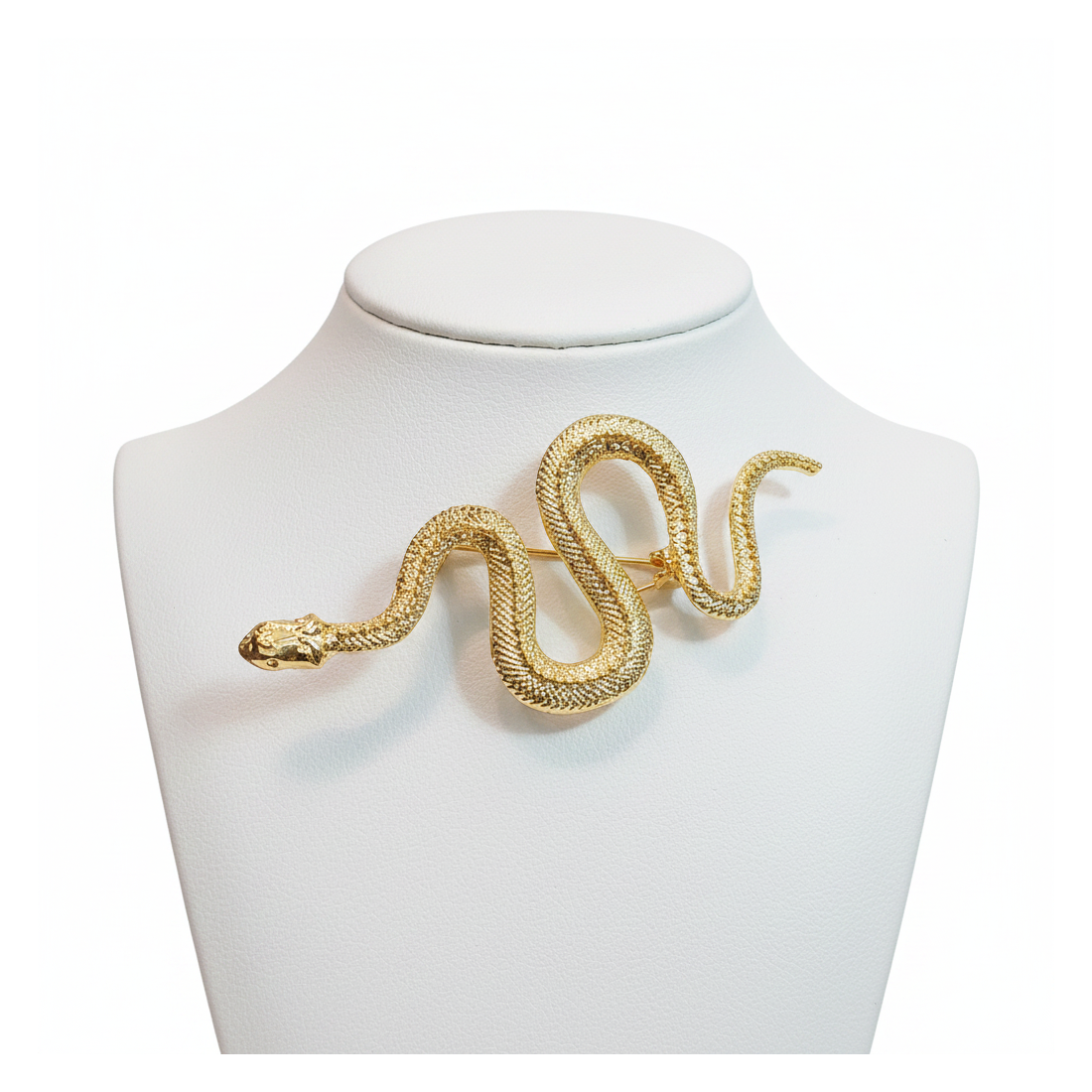 Táto neobyčajná brošňa v tvare vinúceho sa hada je skutočným symbolom elegancie a tajomstva. Vyrobená z pozlátenej zliatiny kovov, očarí jedinečným iskrivým efektom, ktorý nádherne odráža svetlo a dodáva lesk každému outfitu. Ideálne sa hodí ako sofistikovaný doplnok k večerným šatám, elegantnému kabátu alebo saku, zdôrazňujúc váš individuálny štýl. Doprajte si dotyk luxusu a vystúpte z davu s touto hypnotizujúcou ozdobou. Je to vynikajúca voľba pre ženy, ktoré oceňujú originalitu a glamour.