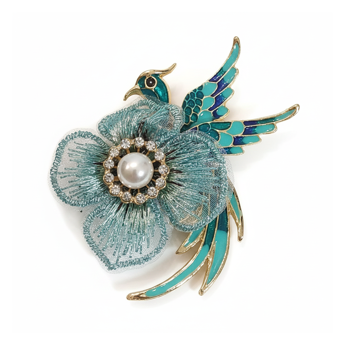 Objavte brošňu Azura, ktorá očarí prepracovanou kombináciou vtáka a kvetu. Vyrobená z kovovej zliatiny, zdobená tyrkysovým smaltom, trblietavými zirkónmi a syntetickou perlou, dodá iskru každému outfitu. Jemný textilný kvet harmonicky ladí s farebným vtákom, čím vytvára jedinečný akcent. Ideálna na skrášlenie kabáta, saka alebo šiat, dodávajúc im výnimočný, elegantný charakter. Je to perfektná voľba pre ženy, ktoré oceňujú originalitu a glamour štýl.