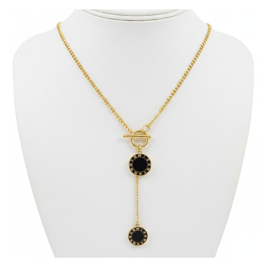 Objavte náhrdelník Roma, ktorý spája klasickú eleganciu s moderným dizajnom. Zlatá retiazka typu pancier s toggle zapínaním krásne zvýrazňuje dvojité prívesky s čiernou výplňou a rímskymi číslicami. Tento jedinečný doplnok dokonale podčiarkne váš štýl a dodá mu nádych luxusu a sofistikovanosti. Vynikajúci na každodenné nosenie aj špeciálne príležitosti, skvelý ako darček.
