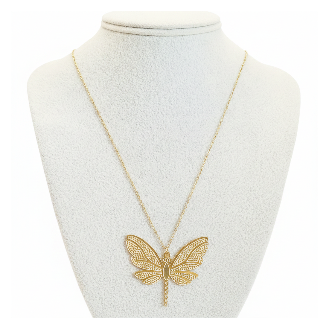 Zlatý náhrdelník s decentným príveskom v tvare vážky je kvintesenciou ľahkosti a elegancie. Jeho prepracované detaily a lesklý povrch priťahujú pohľady a dodávajú iskru každému outfitu. Ideálny na každodenné nosenie aj na špeciálne príležitosti, dokonale podčiarkne váš individuálny štýl. Noste ho samostatne alebo v kombinácii s inými jemnými retiazkami a vytvárajte módne vrstvené kompozycje. Tento šperk vám umožní cítiť sa výnimočne a slobodne.