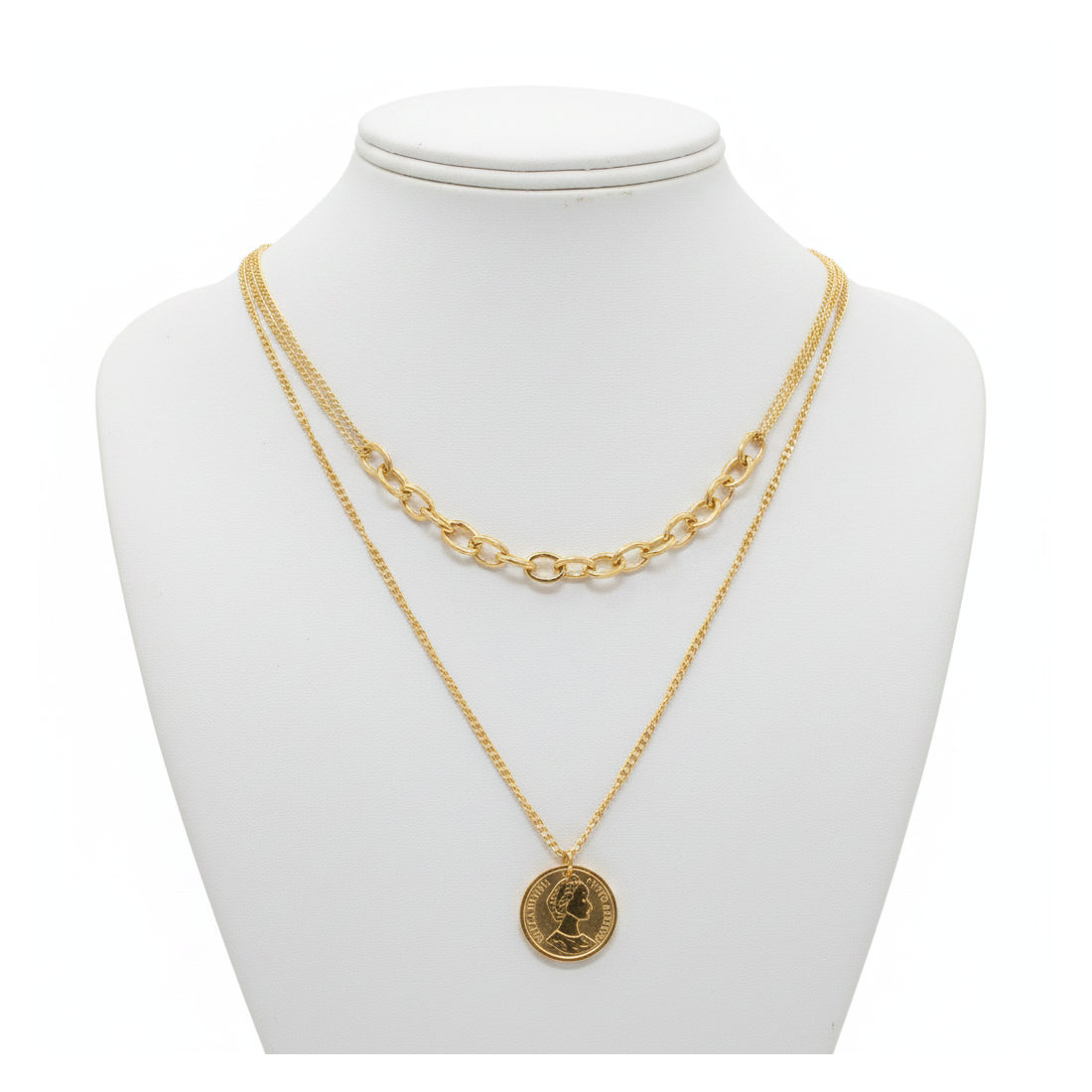 Nechajte sa očariť náhrdelníkom Luna, ktorý kombinuje moderný dizajn s nádychom vintage. Tento dvojvrstvový model sa skladá z hrubšej retiazky s oválnymi článkami a jemnejšej retiazky s okrúhlym príveskom v tvare mince. Zlatá farba mu dodáva eleganciu a robí ho ideálnym pre každodenné aj večerné outfity. Podčiarknite svoj štýl a dodajte iskru každej kreácii vďaka tomuto jedinečnému doplnku.