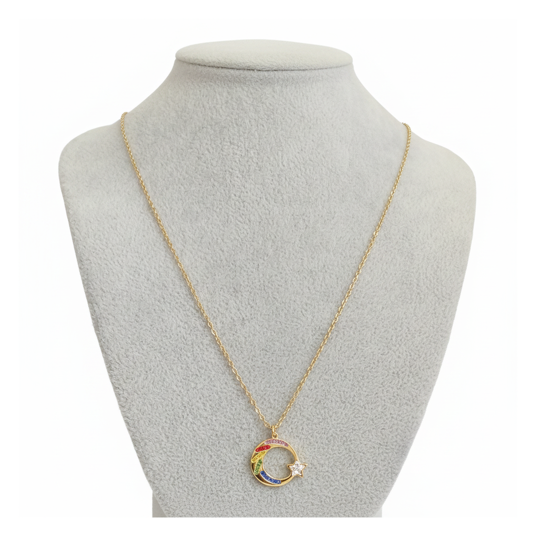Zlatý náhrdelník Luna Dúha je stelesnením jemnosti a moderného glamouru. Jeho očarujúci prívesok v tvare polmesiaca, zdobený zirkónmi vo farbách dúhy, harmonicky kombinuje s trblietavou hviezdičkou. Tento jedinečný doplnok rozžiari každý outfit, dodá mu jemný lesk a nádych farby. Ideálny na každodenné nosenie aj špeciálne príležitosti, podčiarkne váš individuálny štýl a dodá šarm.