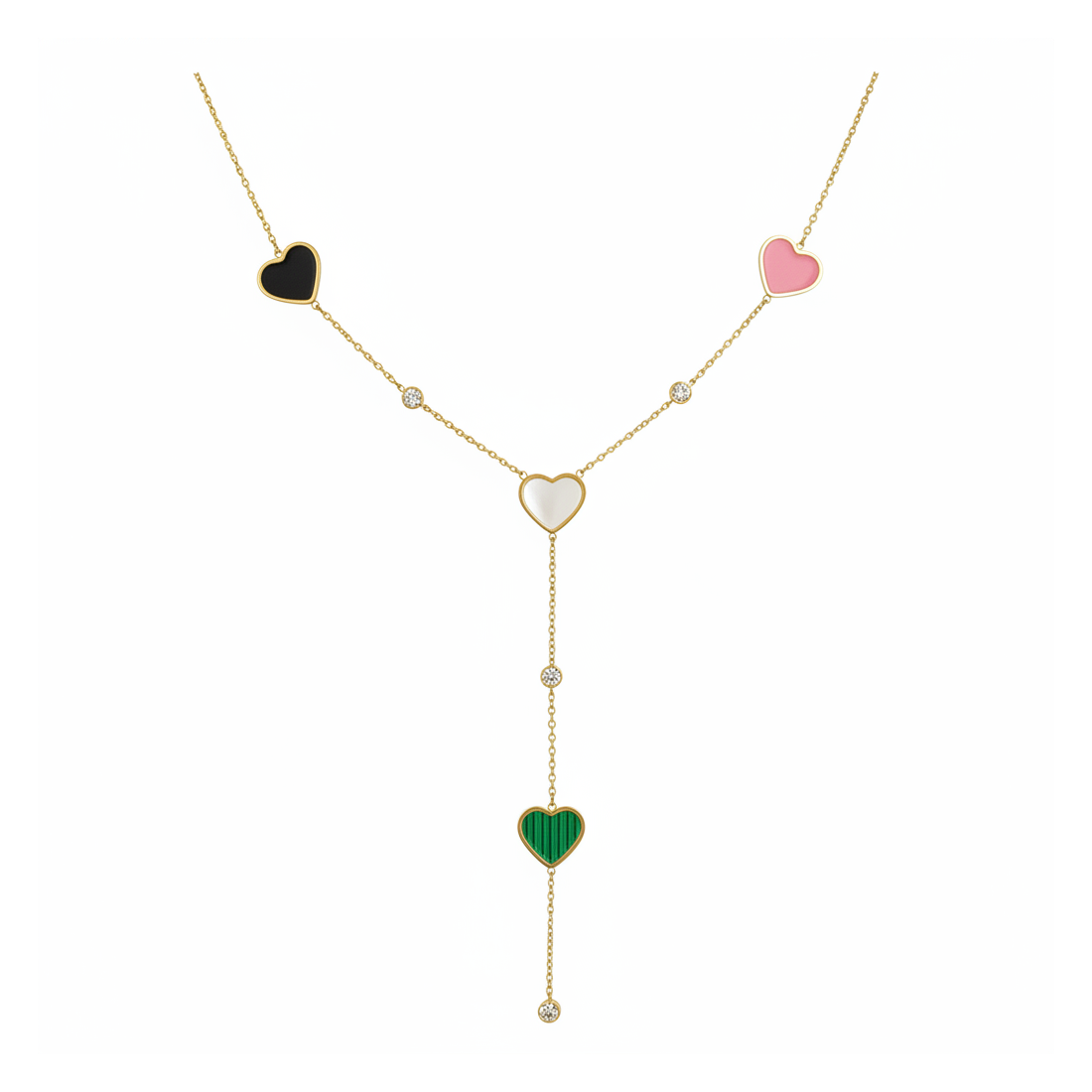 Tento očarujúci náhrdelník je stelesnením ženského štýlu a jemného lesku. Zlatá retiazka je zdobená srdiečkami v odtieňoch čiernej, ružovej, bielej a zelenej, prekladanými trblietavými zirkónmi. Centrálne srdce tvorí elegantný Y-drop, zakončený ďalším oslnivým zirkónom. Ideálny na každodenné nosenie aj špeciálne príležitosti, dodá šarm každému outfitu a podčiarkne vašu individualitu.