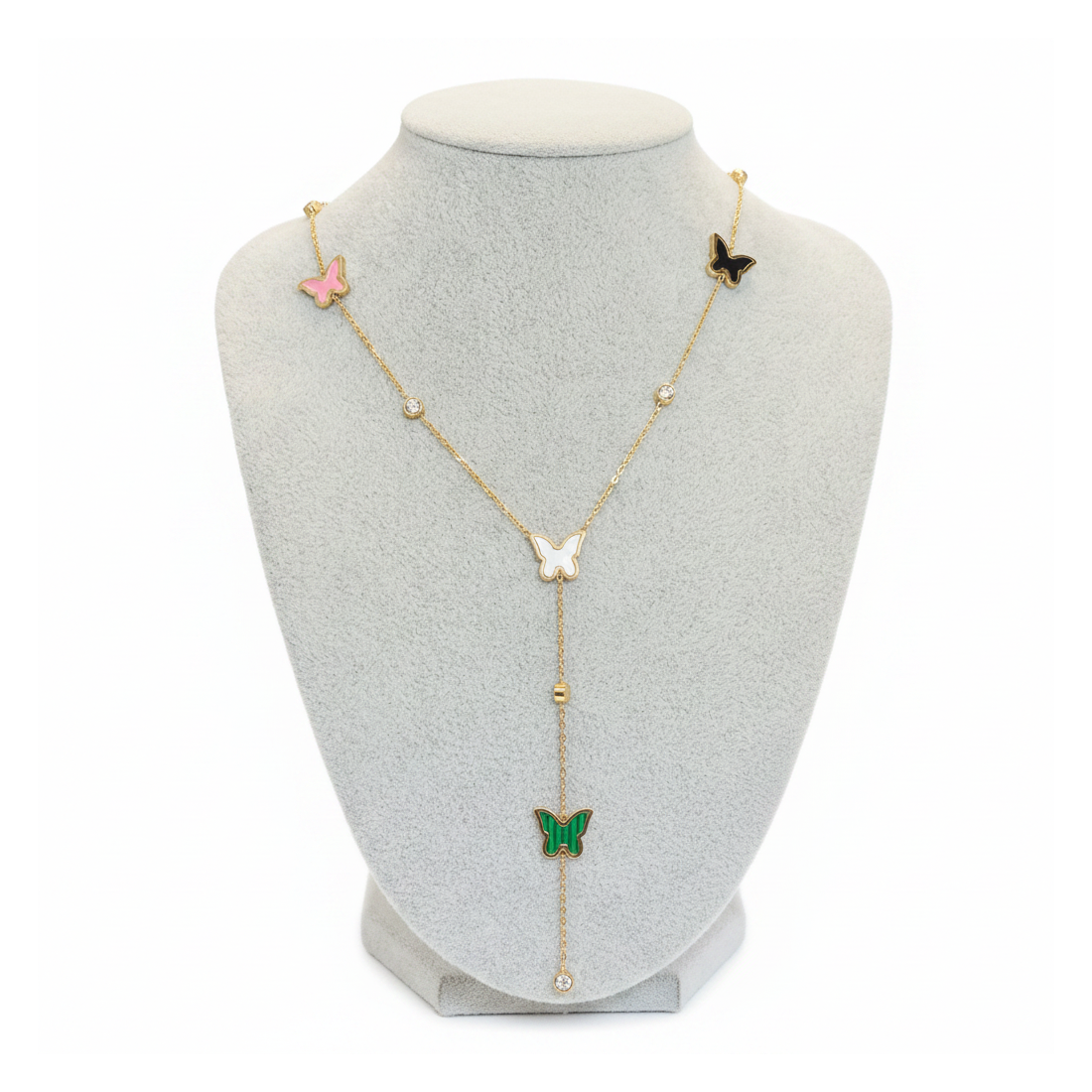 Objavte čaro náhrdelníka Motýle Šarm, ktorý zaujme jemnou kombináciou zlatej farby s farebnými smaltovanými motýlikmi. Každý motýlik v odtieňoch ružovej, čiernej, bielej a zelenej dodáva šperku ľahkosť a dievčenský pôvab. Drobné, lesklé zirkóny umiestnené pozdĺž retiazky a na konci visiacej časti krásne odrážajú svetlo. Tento očarujúci náhrdelník je ideálnym doplnkom k letným outfitom, rande alebo každodenným štýlom, prinášajúc nádych fantázie a elegancie.