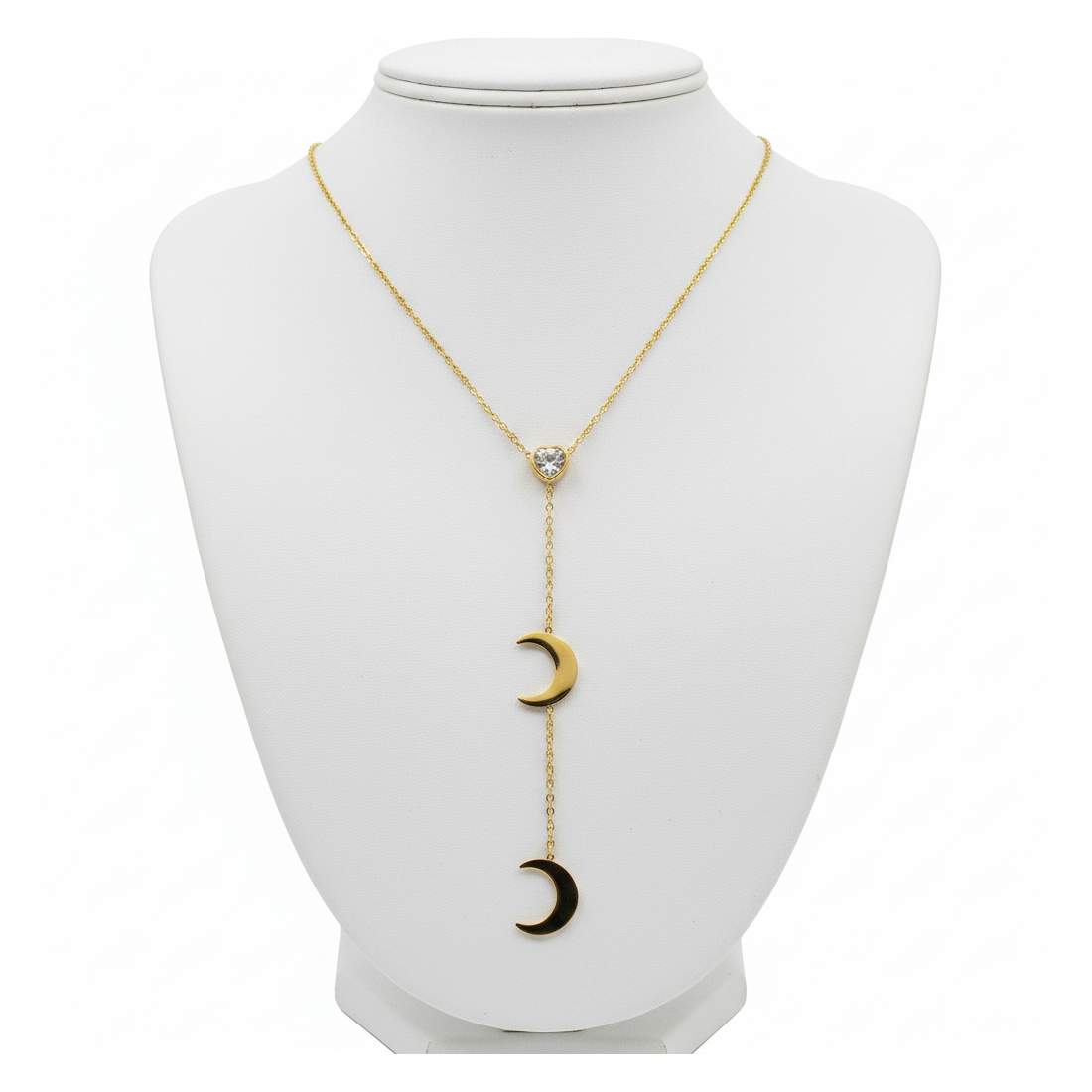 Tento očarujúci náhrdelník Luna je stelesnením jemnosti a moderného pôvabu. Zlatá retiazka zdobí decentné srdiečko s trblietavým zirkónom, z ktorého elegantne visia dva pôvabné polmesiace. Ideálny na každodenné nosenie aj špeciálne príležitosti, dodá iskru každému vzhľadu. Podčiarknite svoj štýl týmto jedinečným doplnkom.