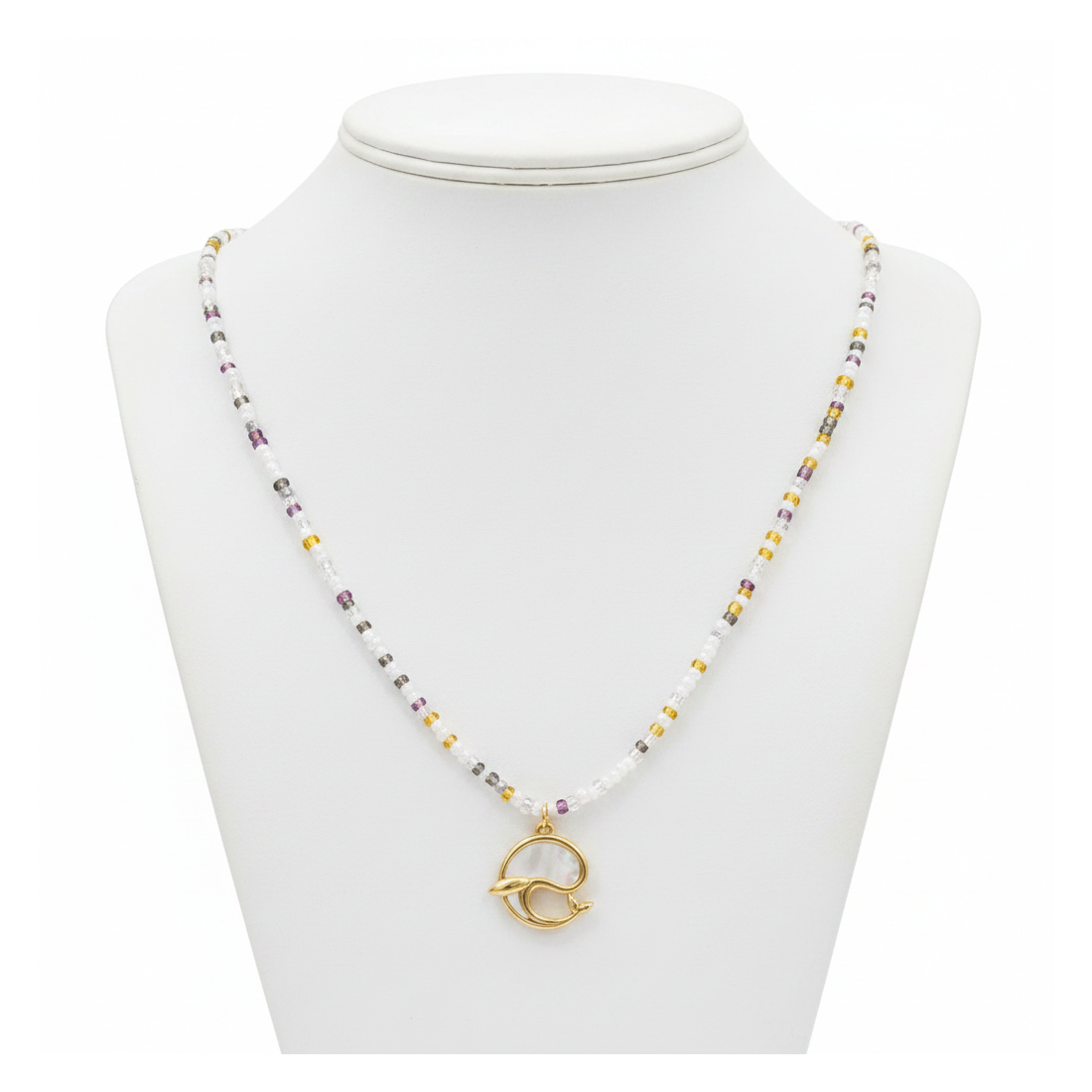 Objavte čaro náhrdelníka Aura, ktorý očarí jemnou kombináciou farebných korálok a elegantného prívesku. Centrálnym bodom je zlatý prívesok s nádherne sa trblietajúcou perleťou, dodávajúci šperku jedinečný charakter. Jemná retiazka z drobných sklenených korálok v odtieňoch bielej, zlatej a fialovej dokonale dopĺňa celok. Tento náhrdelník je ideálnym doplnkom pre každodenné aj sofistikovanejšie outfity, podčiarkujúc vašu ženskosť a štýl.