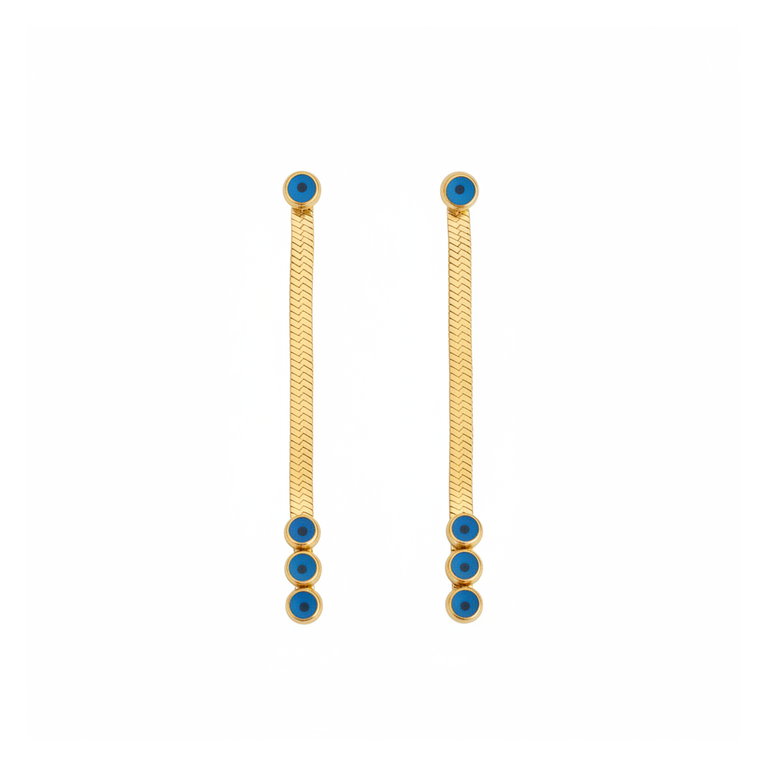 Objavte čaro náušníc Cindy Očká, ktoré spájajú moderný dizajn s nádychom orientálnej symboliky. Vyrobené z pozlátenej chirurgickej ocele, tieto visiace náušnice sú nielen krásne, ale aj odolné. Ich plochá zlatá retiazka elegantne padá a tri modré 'očká' im dodávajú jedinečný charakter. Ideálne pre ležérne aj večerné štýly, podčiarknu vašu individualitu a dodajú lesk každému outfitu.