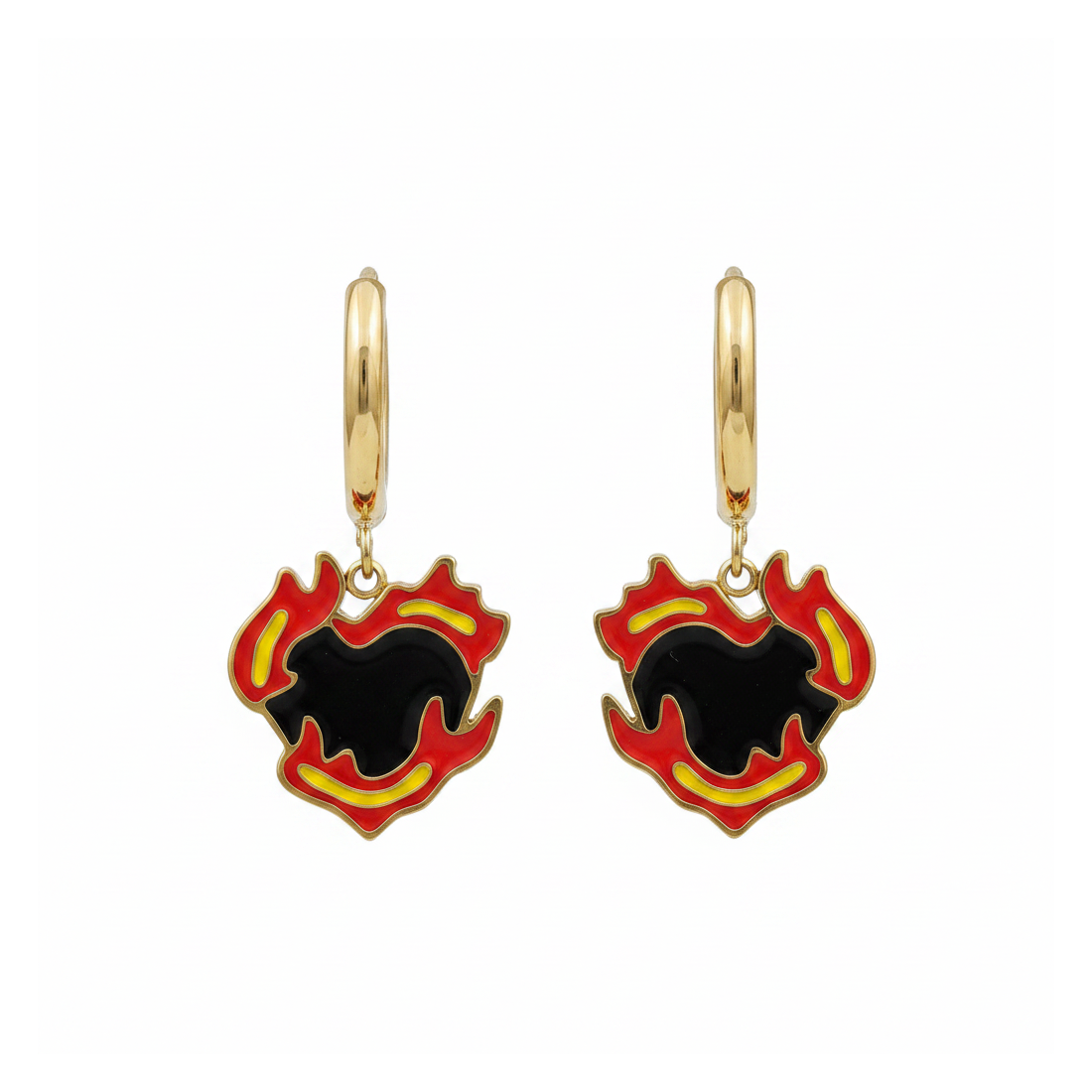 Tieto neobyčajné kruhové náušnice s príveskami v tvare sŕdc sú skutočnou lahôdkou pre milovníčky originálnych šperkov. Zlatý odtieň kovu dokonale ladí s intenzívnou červenou, hlbokou čiernou a energickou žltou smaltu, vytvárajúc dynamický, plamenný vzor. Ideálne na večerné vychádzky, festivaly alebo ako výrazný doplnok k dennému outfitu. Podčiarknite svoj jedinečný charakter a dodajte svojmu vzhľadu oheň s týmito výnimočnými náušnicami.